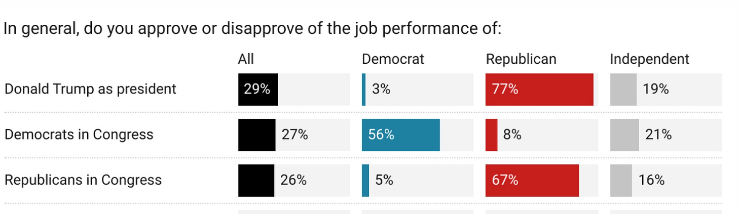 Both Congressional Democrats (27%, +4 since Spring) and congressional Republicans (26%, -3 since Spring) rank extremely poorly amongst young people in job approval.