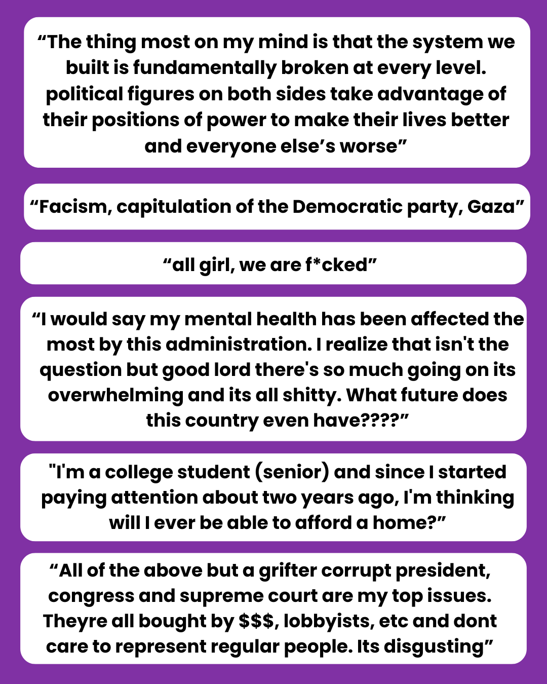 This fall, our Distributed team talked with nearly 6,000 young people between the ages of 18-29 over text or phone and asked them what their top issues are right now. A majority listed several issues and could not name just one – with many people mentioning how they view the issues as intertwined. A few quotes from these conversations are below.