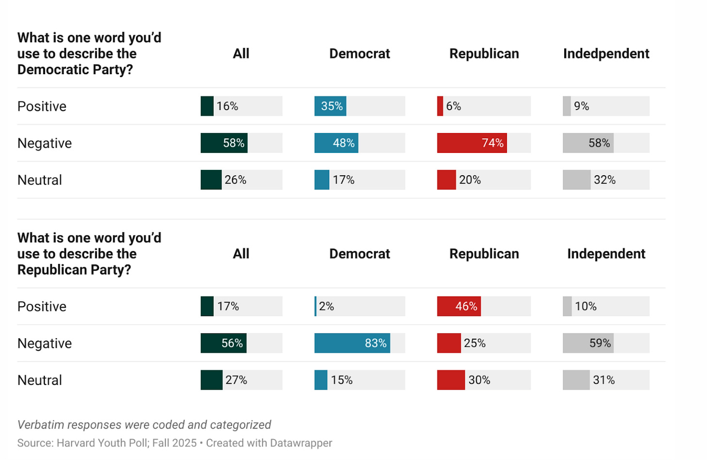 In Harvard’s recent youth vote poll, the findings were the same. As Harvard’s Youth Poll summarizes, “Young Americans rate President Trump and both major political parties poorly, offering overwhelmingly negative descriptions of Democrats and Republicans alike — and while Democrats lead for 2026, that support stems more from caution than genuine enthusiasm.” In Harvard’s Poll, when asked for one word to describe each party, 58% of young people polled used a negative word for Democrats — most commonly “weak” — and 56% used a negative word for Republicans, most often “corrupt.” Just 17% offered a positive word for Republicans (27% neutral), and only 16% offered a positive word for Democrats (26% neutral).
