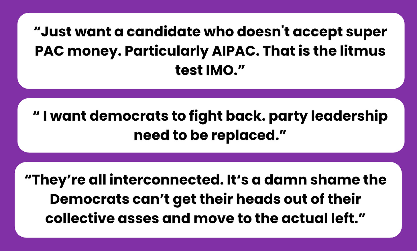 When our Distributed team recently asked young people for their top issues under the current administration, respondents brought up politicians and parties unprompted. While a majority of respondents who listed Democracy as their top concern mentioned the President or this administration, some respondents mentioned their frustrations with the Democratic party or particular establishment/moderate Democrats on their own. Common themes include believing Democrats are not doing enough, not listening, and a dislike for any politician who takes AIPAC money.